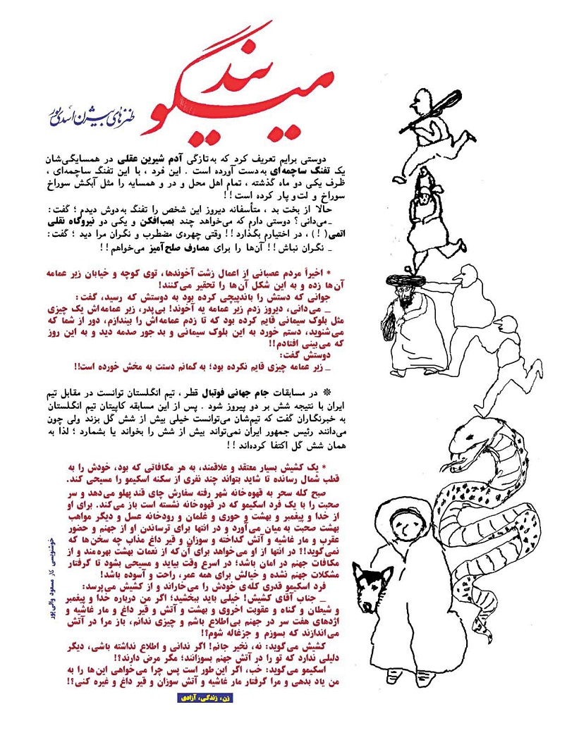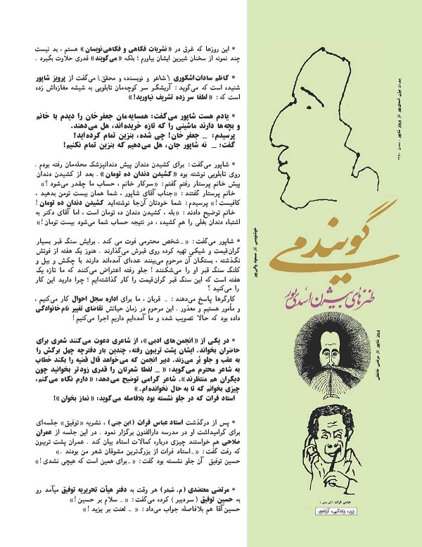 بیژن اسدی پور ـ کشش من به مطالب فکاهی و طنزآمیز و نوشتن این گونه مطالب کاملا تصادفی اتفاق افتاد. اوایل که تازه شروع کرده بودم، مطالبی کاملا جدی می نوشتم و برای دوستان نزدیک و فامیل می خواندمـ می دیدم مطلب جدی من کاملا فکاهی شده است! روزی دوستی راهنمایی کرد و گفت ندیده ای کسانی برای «تخلص» شعری از دیوان حافظ فال می گیرند و حافظ آن ها را راهنمایی می کند؟ برای شما هم همین مطالب جدی دارند راهنمایی می کنند که جدا فکاهی بنویسید! دیدم درست می گویند! این بود که از همان زمان شروع کردم به فکاهی نویسی، یعنی مطالبی جدی می نوشتم که خودش به طور اتوماتیک فکاهی می شد! علی ـ از چه زمان همکاری تان به صورت حرفه ای با روزنامۀ توفیق و نشریات دیگر شکل گرفت؟