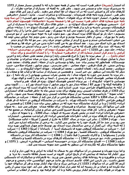علی صدر ـ همکاری تان با پرویز شاپور و عمران صلاحی چگونه آغاز شد؟ بیژن اسدی پور ـ شاعران و نویسندگان توفیق (هیئت تحریریه) در محل «چاپخانه رنگین» می نشستند. کسانی که مهم تر بودند میز کوچکی داشتند و کسانی که اهمیت چندانی ندشتند، دور یک میزی که مثل میز نهارخوری بود کار می کردند. من روی همین میز نهارخوری مانند می نشستم و کار می کردم. روبه روی من مرتضی فرجیان (شاگرد تنبل)، عمران صلاحی (بچه جوادیه)، محمد خرمشاهی (گل مولا)، محمد اجتهادی (زالاس) و محمد حاجی حسینی (نازک نارنجی) می نشستند. در سمت چپ هم میز کار کیومرث صابری (گردن شکستۀ فومنی) بود. حسین آقای توفیق هم در بالای اتاق تحریریه کنار پنجره می نشست. کسانی که دور این میز نهارخوری کنار من می نشستند: احمد سیدنا (خیار چمبر)، هوشنگ معمارزاده (موش مرده)، محمود گیوی (بزبز قندی)، پرویز شاپور (مهدخت) و… را می توانم نام ببرم. از همان جا بود که با شاپور و عمران آشنا شدم. زمانی بود که در تدارک انتشار کتاب «طنزآوران امروز ایران» بودم که با عمران همفکری کردیم و مجموعه را به اتفاق منتشر کردیم. علی صدر ـ شما فعالیت هایتان را در غربت هم ادامه دادید، از جمله کتاب های متعددی در زمینۀ کاریکاتور و طنز به چاپ رساندید. دربارۀ این کتاب ها بگویید و این که آیا امکان تهیه آن ها هنوز وجود دارد؟ بیژن اسدی پور ـ بله، انسان وقتی به کاری باطل دست زد، نمی تواند یک باره همه چیز را متوقف کند! من در بیرون هم به این کارهای باطل پرداختم و ادامه دادم ـ چندین مجموعه از کارهایم چاپ شد. مثل وقایع روزمره که در ارتباط با انقلاب ایران بود و دوری یات که مجموعه ای از نوشته های طنزآمیزم در خارج را دربر می گیرد و چند کتاب دیگر. اگر هنوز هم پیدا بشوند، دیگر هیچ ناشری با من سلام و علیک هم نخواهد کرد! علی صدر ـ یکی از کارهای منحصر به فرد و ماندنی ای که انجام داده اید تهیه و انتشار نشریۀ دفتر هنر است که مجله ای است پر و پیمان که در هر شماره به معرفی یکی از شخصیت های هنری، فرهنگی و اجتماعی اختصاص دارد. چه شد که به این فکر افتادید و چند شمارۀ آن تاکنون به چاپ رسیده است؟