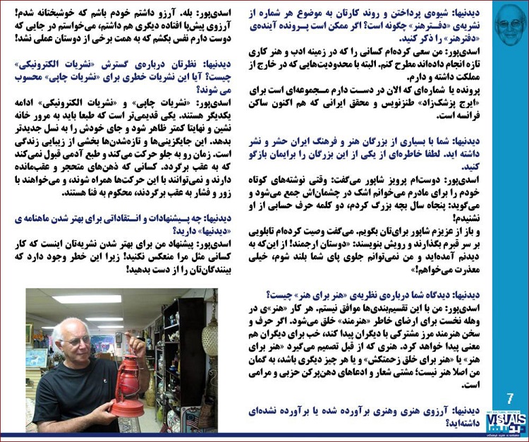 علی صدر ـ می دانم که به خاطر مشکلات عدیده، چاپ مجدد دفتر هنرهای قدیمی عملی نیست ولی می دانم که خوشبختانه قرار است به زودی با همکاری کانون فرهنگی ایرانیان شماره های گذشته به طور دیجیتال و آنلاین در دسترس علاقمندان قرار گیرد. لطفا در این زمینه اگر ممکن است توضیح دهید. بیژن اسدی پور ـ بله، با محبت و کمک دوستان عزیز علاقمندی مثل شما، قرار است این کار را بکنیم. نمونه های دیجیتال را با کیفیت بسیار خوب آماده خواهیم کرد. در اولین فرصت که ممکن باشد شماره های مختلف دفتر هنر را در دسترس علاقمندان قرار خواهیم داد. چون حجم کار زیاد است، لذا این کار به مرور صورت خواهد گرفت. علی صدر ـ دفتر هنری که قرار است نوروز امسال منتشر شود، لطفا دربارۀ این شماره (که می دانم ماه هاست روی آن کار می کنید و قرار است در تعداد بسیار محدود چاپ شود) توضیحاتی بدهید. بیژن اسدی پور ـ سعی می کنیم این شماره را از طریق اینترنت در اختیار همه قرار دهیم. تعداد کمی هم همان طور که فرمودید پخش خواهد شد برای کسانی که علاقمند باشند نسخه ای داشته باشند یا برای دانشگاه هایی که همۀ شماره های گذشتۀ این نشریه را دارند. هشت ـ چگونه می توان شمارۀ جدید دفتر هنر را تهیه کرد؟ بیژن اسدی پور ـ از طریق کانون فرهنگی شما، یا از طریق مجلۀ دفتر هنر و همۀ کتابفروشی های لس آنجلس. علی صدر ـ از وقتی که در اختیار خوانندگان «پیک» قرار دادید سپاسگزارم. بیژن اسدی پور ـ من هم از شما برای فرصتی که به من دادید سپاسگزاری می کنم، امیدوارم این گفتگو به تیراژ نشریه تان صدمه نزند