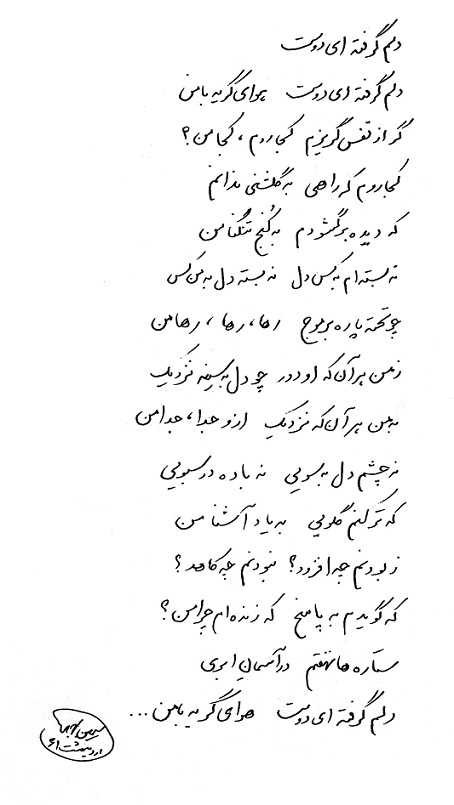 [+] «سالهای بد بود. سالهای بعد از اعدامهای روی پشتبام و محکمههای بیعدالتی بهنام عدالت و قسط اسلامی. دلم از ویرانیها گرفته بود. در خانه تنها بودم. توی آشپزخانه یک میز کوچک بود و من بودم و کاغذ و قلم در دستم و هزار غم در دلم. نشستم. شعر در جانم میجوشید. ویرانیها را میدیدم و در فکر آن بودم که چه میتوان کرد؟ وطن درهم شکسته و ویران بود. برخاستم. یک فنجان چای ریختم و به آرزوهای لگدمالشده اندیشیدم. کسی را نداشتم که با او درد دل کنم. دو سه شب پیش «سیمین» را دیده بودم. «سیمین دانشور» ویرانتر از خودم و سرگردانتر از من. هنوز «جزیرۀ سرگردانی» را ننوشته بود. با من که حرف میزد انگار ایستاده است و از ته قلب من فریاد میکُند. یکمرتبه شعر آمد. شعری که امید را به فردا نشان میدهد. ته قلبم روشن شد. فکر کردم اگر هم مُرده باشم دوباره برمیخیزم که اهرمن ویرانگر را درهم بشکنم. نوشتم: «دوباره میسازمت وطن» از دلم پرسیدم: «با چی؟» و دل گفت: «اگرچه با استخوان خویش . . .» و شعر شکل گرفت. همین شعری که دارید میخوانید «دوباره میسازمت وطن» و شعر را به «سیمین دانشور» هدیه کردم که همیشه دلش مثل من برای دوباره ساختن وطن میتپد.»