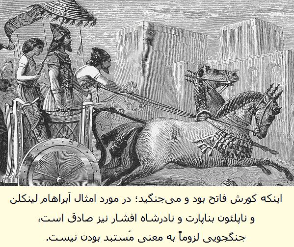 بر پایۂ دو سند بابلی، یعنی «استوانۂ گلی نَبونَئید» و «تاریخشمار نَبونَئید»، Nabonidus Chronicle، کورش از پدر زنش (آستیاگ) که فرمانروای ماد بود هم نمیگذرد و با بیرحمی حساب او را میرسد. (البته اینکه وی واقعاً پدر زن کورش بوده یا نه، بر من معلوم نیست). ...