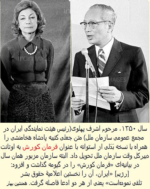 چنین مطالبی مطلقا در منشور کورش نیست. البته میتوان انشا نوشت و با صدای غرا دکلمه کرد اما چه سود وقتی حتی یک کلمه از آن در منشور کورش یافت نمیشود؟! ــــــــــــــــ