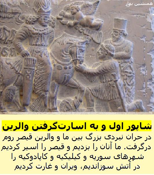است. ... در کتیبه شاپور اول ساسانی [بر دیوار کعبه زرتشت در نقش رستم] آمدهاست: «در حران نبردی بزرگ بین ما و والرین قیصر روم درگرفت. ما آنان را بزدیم و قیصر را اسیر کردیم...شهرهای سوریه و کیلیکیه و کاپادوکیه را در آتش سوزاندیم، ویران و غارت کردیم...»
