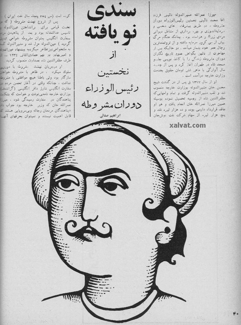 ابراهيم صفائی : سندی نويافته از اولين رئيس الوزرای مشروطه [ اين نوشته از شماره های جلد شدهء دوره اول "نگين"(چاپ تهران) آمده است و بخاطر ِ فشردگی صفحات ، اسکن کردنِ آنها دشوار بود ونارسائی و کج ومعوجی هائی دارد - اما بهرحال قابلِ خواندن است. با پوزش - م. ايل بيگی]