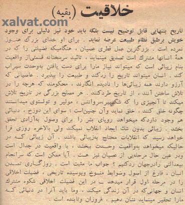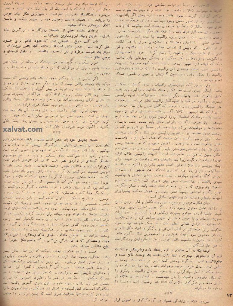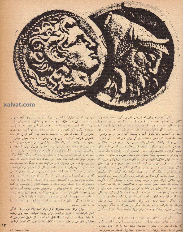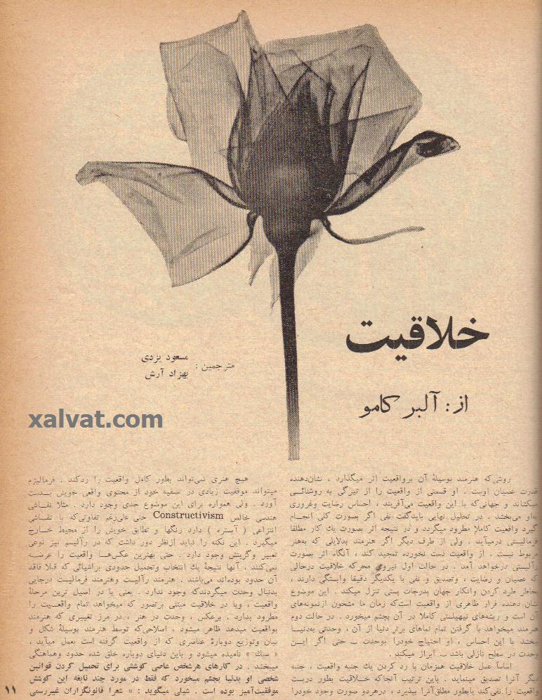 696 آلبر کامو (برگردان : مسعود يزدی / بهزاد آرش) : خلاقيت [ اين نوشته از شماره های جلد شدهء دوره اول "نگين"(چاپ تهران) آمده است و بخاطر ِ فشردگی صفحات ، اسکن کردنِ آنها دشوار بود ونارسائی و کج ومعوجی هائی دارد - اما بهرحال قابلِ خواندن است. با پوزش - م. ايل بيگی]