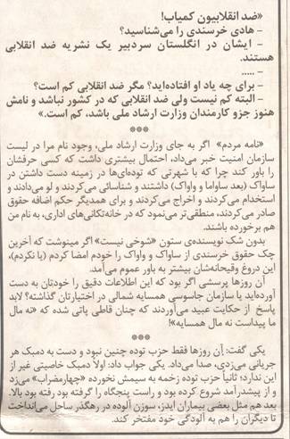 فعلا این تریبونی است که برای توده ای ستیزی دراختیاردارد وروزنامه های « مردم » و « نامه مردم» ارگان مطبوعاتی حزب توده ایران درسال های پس ازانقلاب را باهم ورق می زنند وباوصله پینه کردن مطالبی که ازآنها برگرفته، پس ازجدا کردن آنها اززمان ومکان مطالب چهل تکه می نویسند وبه تنور کیهان می زنند.