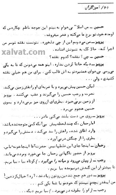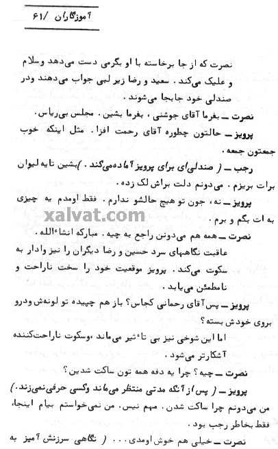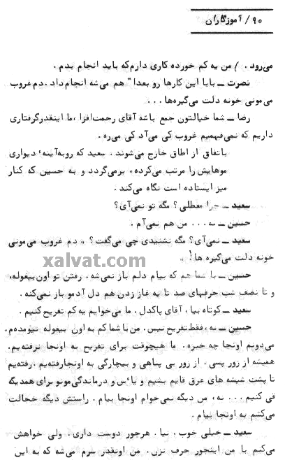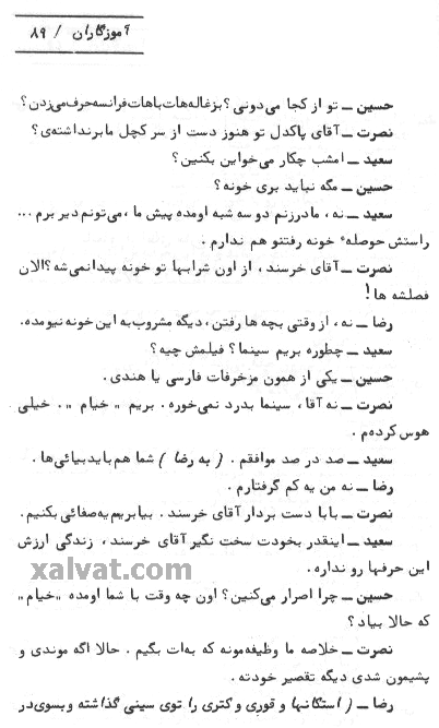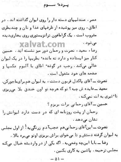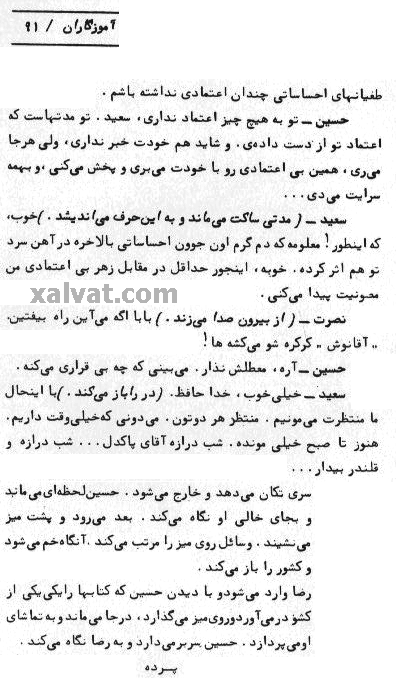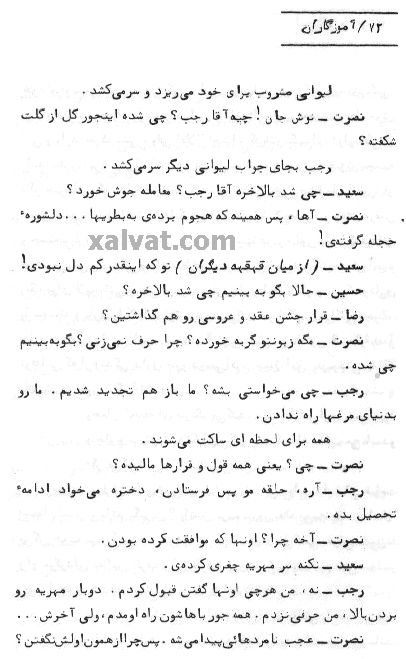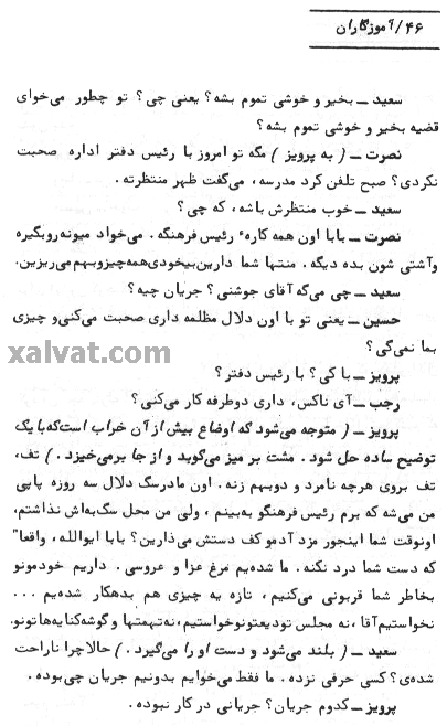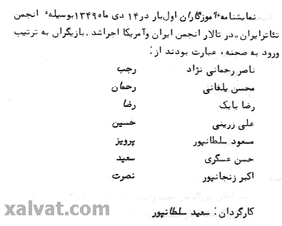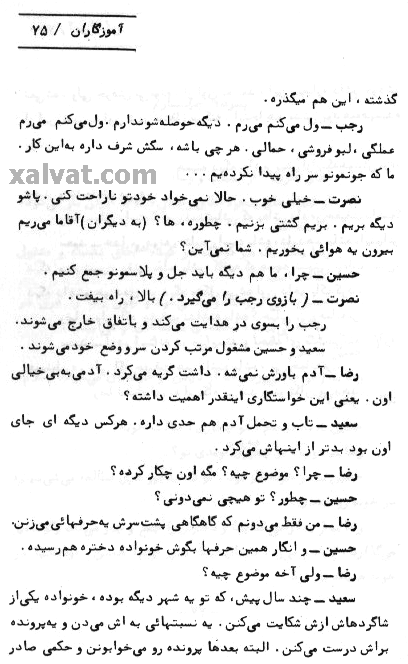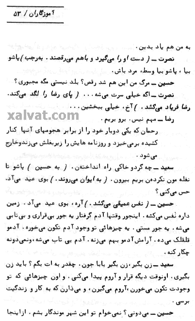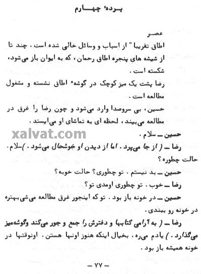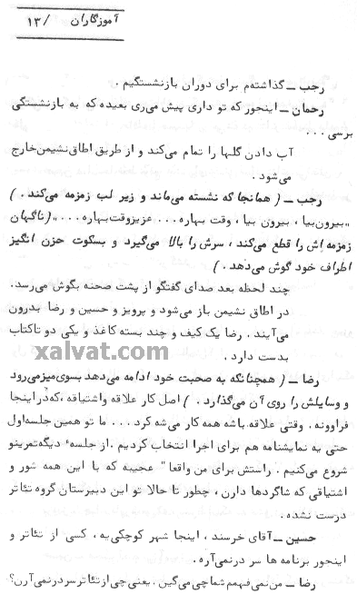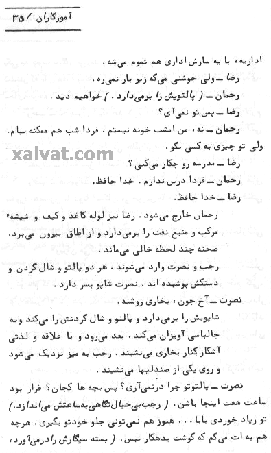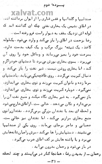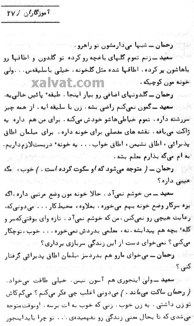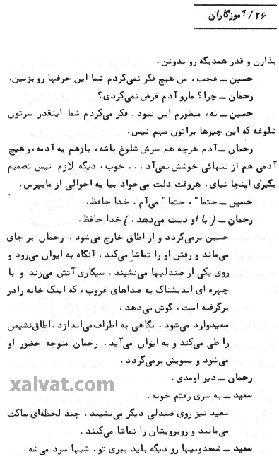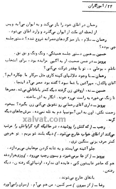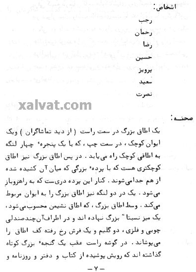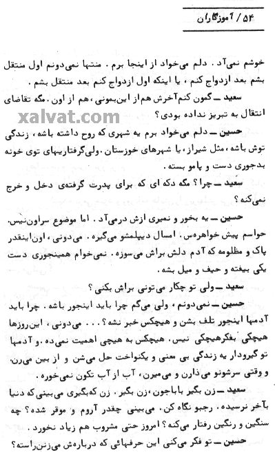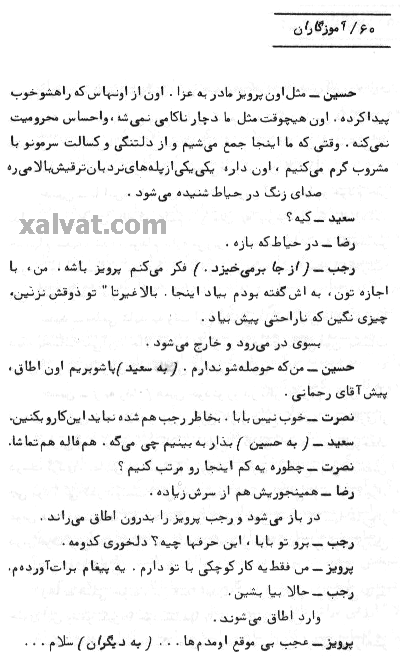 2. در نمایش «انتظار سحر»، حاجی فیروز بالای سر نوروز میایستد. دایره میزند و میرقصد و زیر لب ترانهٔ مشهورش را میخواند. نوروز غلت میزند. پشت اش را به او میکند و پلاس اش را بر سر میکشد. فیروز یکی- دوبار به روی نوروز خم میشود و دایره زنگی اش را به گوش او نزدیک میکند- گویی قصد بیدار کردن او را دارد... نمایشنامه آموزگاران، در ساحل، ملاقات، دونده تنها، مرد متوسط، در ایران نوشته شدهاست: در فرانسه: «قوی تر از شب»، «بن بست»، «در آخرین تحلیل»، «در یک خانواده ایرانی»، «انتظار سحر»، «یک مهمان چند روزه».