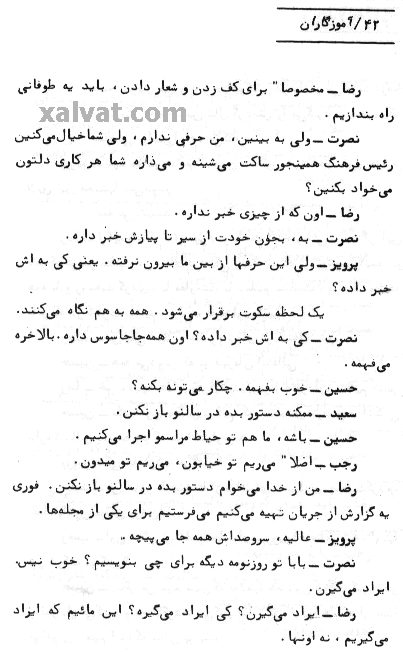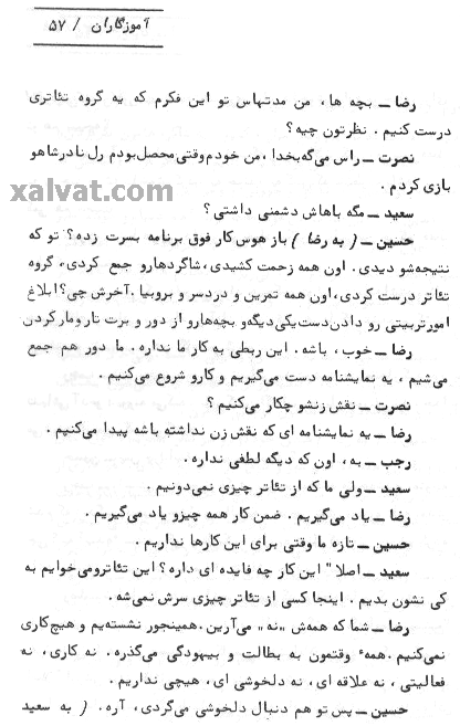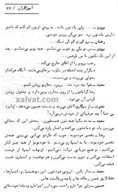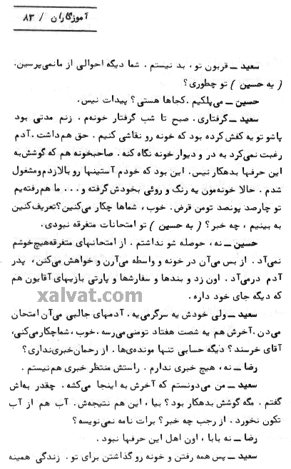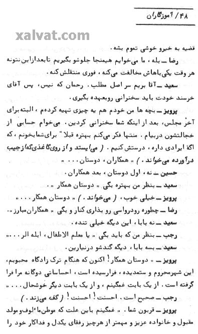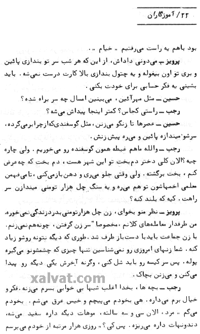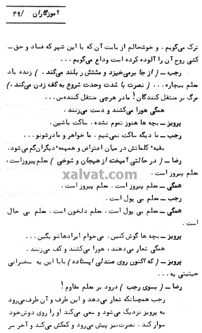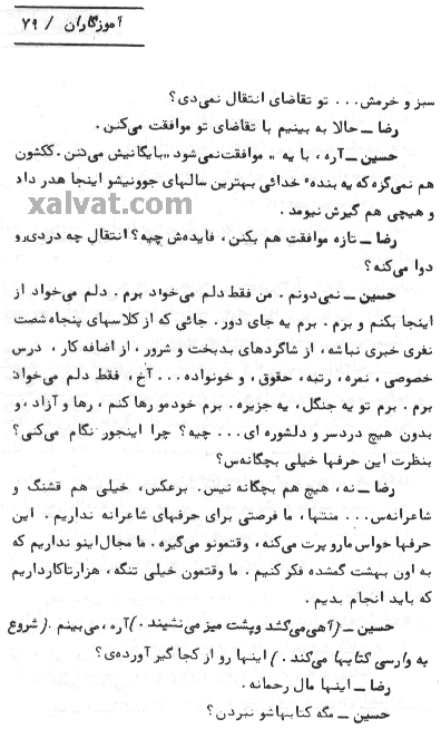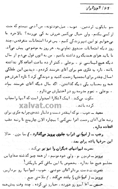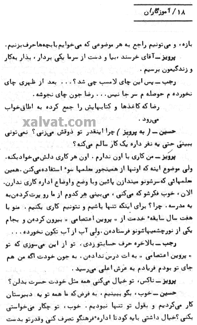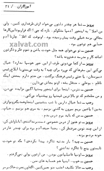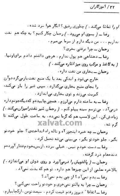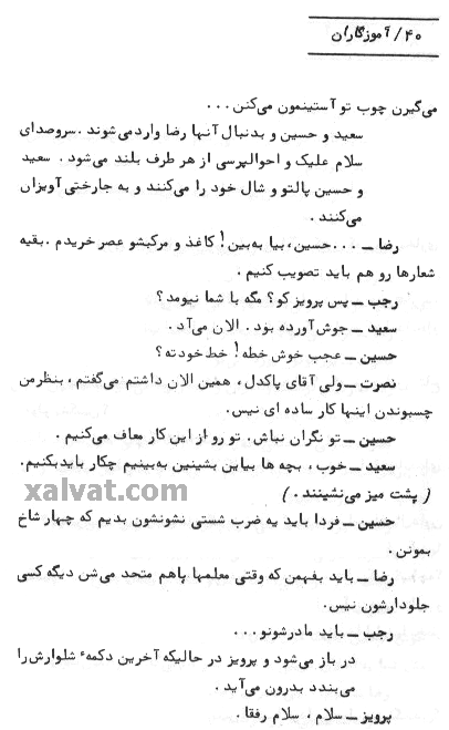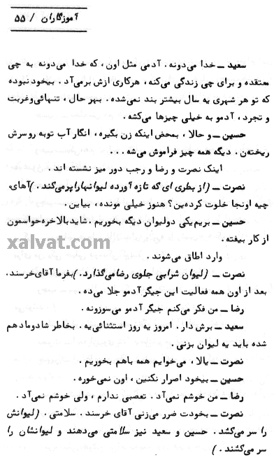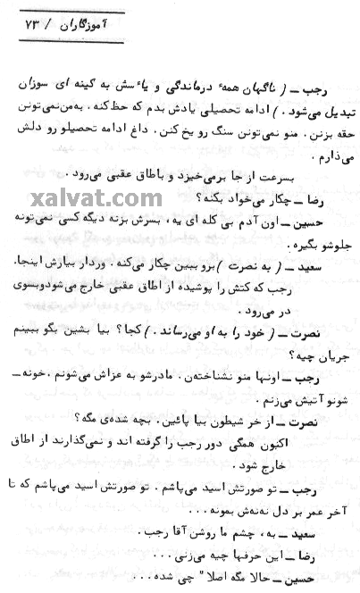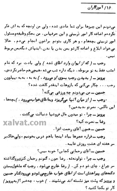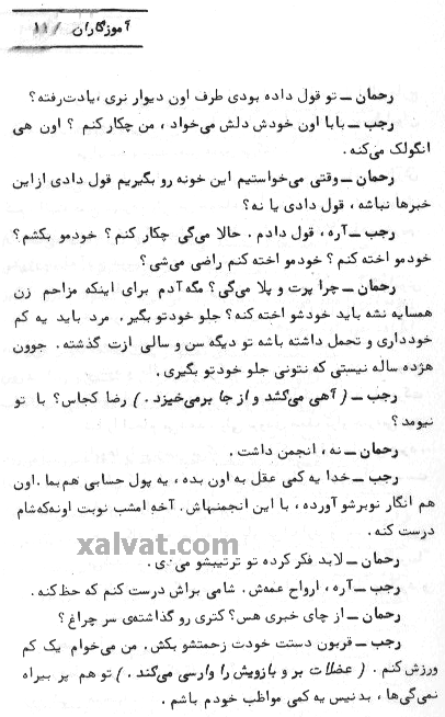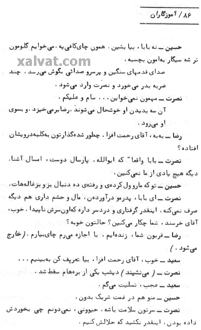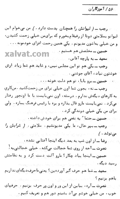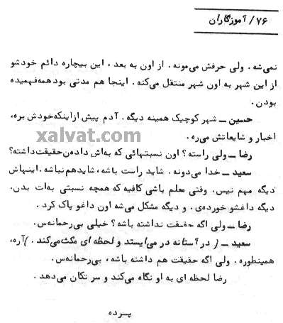 2. در نمایش «انتظار سحر»، حاجی فیروز بالای سر نوروز میایستد. دایره میزند و میرقصد و زیر لب ترانهٔ مشهورش را میخواند. نوروز غلت میزند. پشت اش را به او میکند و پلاس اش را بر سر میکشد. فیروز یکی- دوبار به روی نوروز خم میشود و دایره زنگی اش را به گوش او نزدیک میکند- گویی قصد بیدار کردن او را دارد... نمایشنامه آموزگاران، در ساحل، ملاقات، دونده تنها، مرد متوسط، در ایران نوشته شدهاست: در فرانسه: «قوی تر از شب»، «بن بست»، «در آخرین تحلیل»، «در یک خانواده ایرانی»، «انتظار سحر»، «یک مهمان چند روزه».