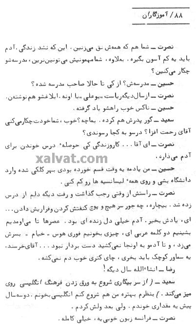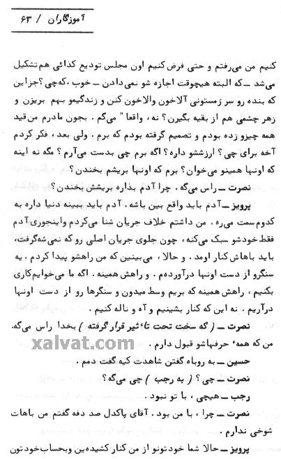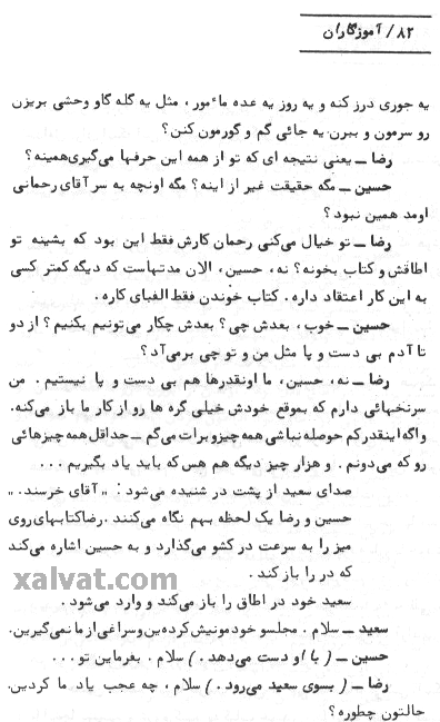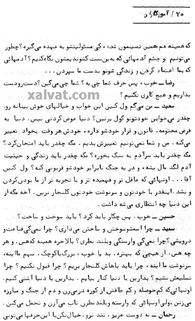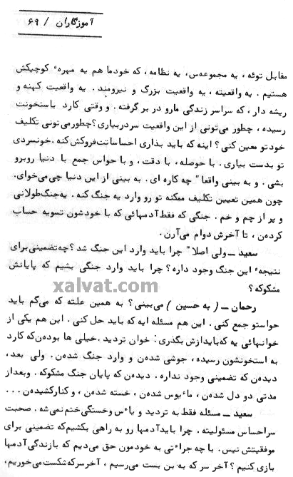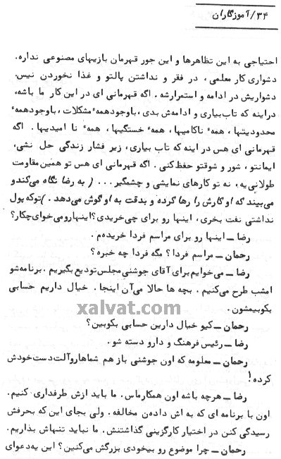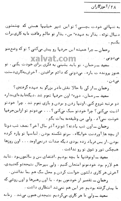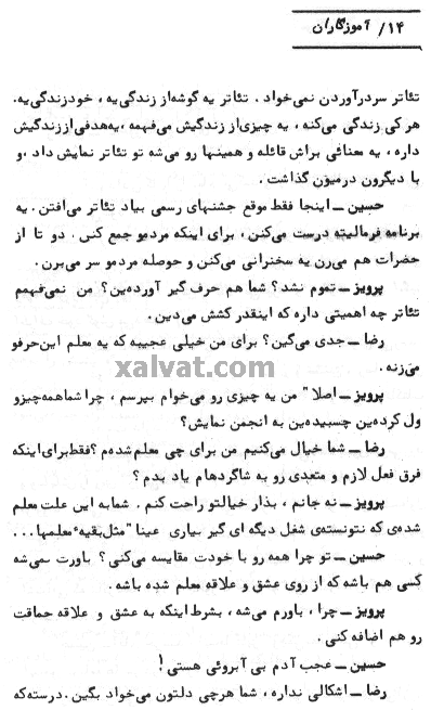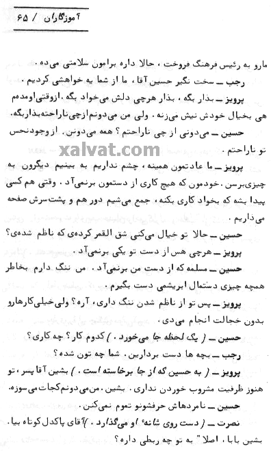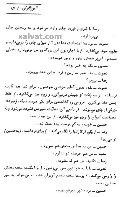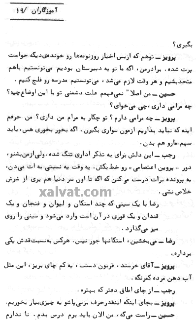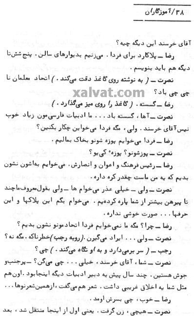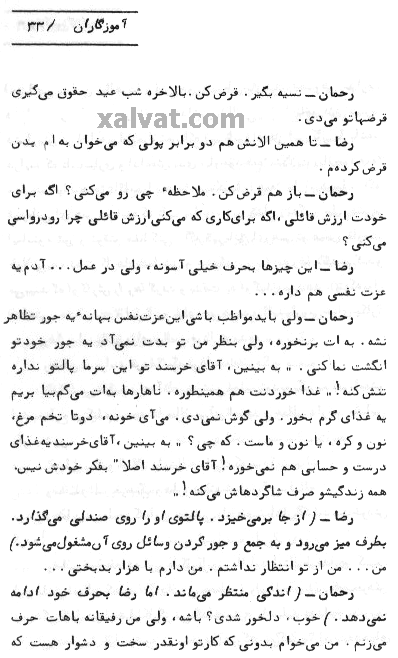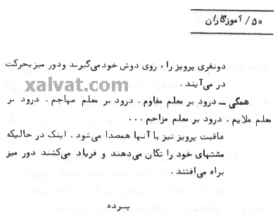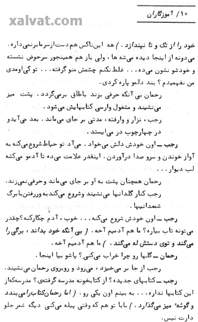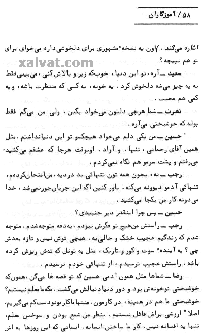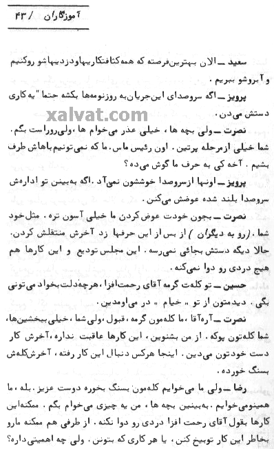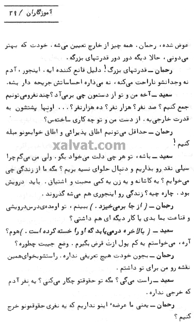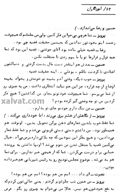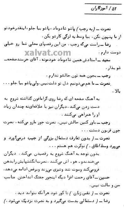 2. در نمایش «انتظار سحر»، حاجی فیروز بالای سر نوروز میایستد. دایره میزند و میرقصد و زیر لب ترانهٔ مشهورش را میخواند. نوروز غلت میزند. پشت اش را به او میکند و پلاس اش را بر سر میکشد. فیروز یکی- دوبار به روی نوروز خم میشود و دایره زنگی اش را به گوش او نزدیک میکند- گویی قصد بیدار کردن او را دارد... نمایشنامه آموزگاران، در ساحل، ملاقات، دونده تنها، مرد متوسط، در ایران نوشته شدهاست: در فرانسه: «قوی تر از شب»، «بن بست»، «در آخرین تحلیل»، «در یک خانواده ایرانی»، «انتظار سحر»، «یک مهمان چند روزه».
