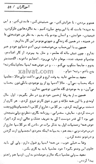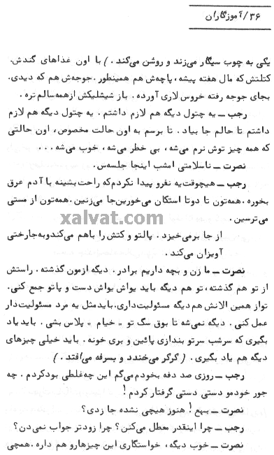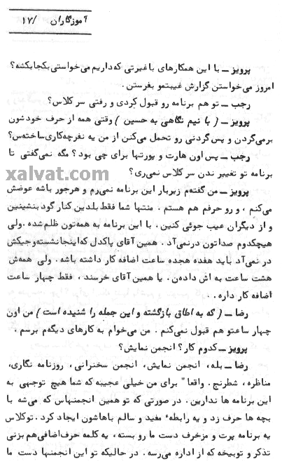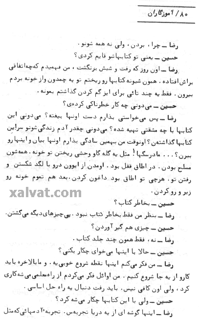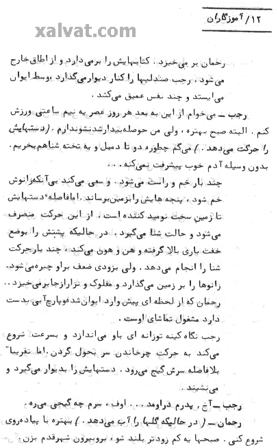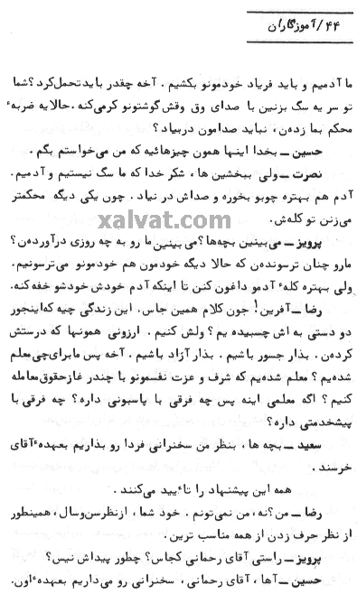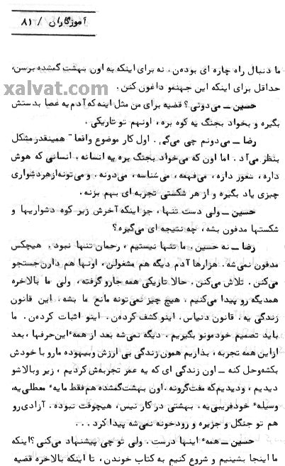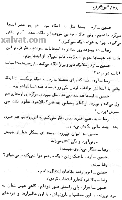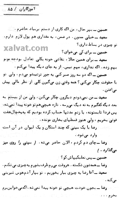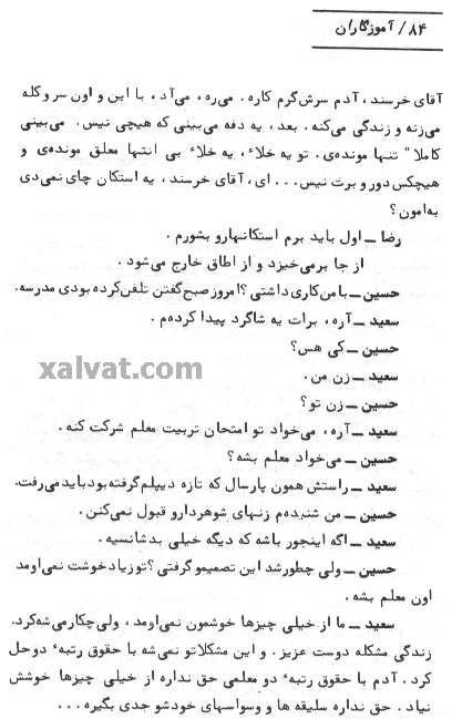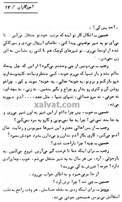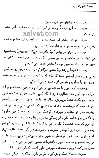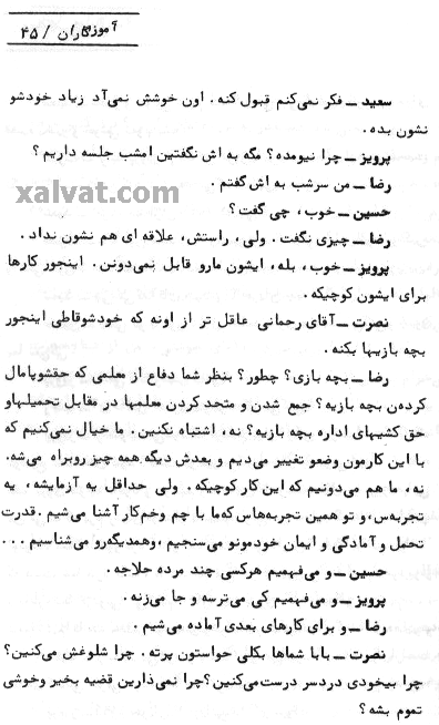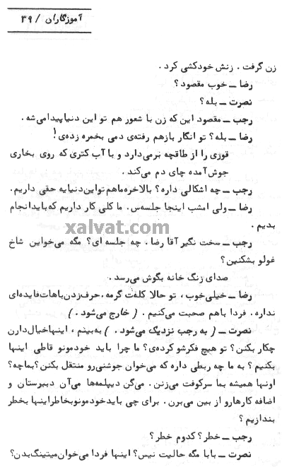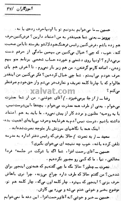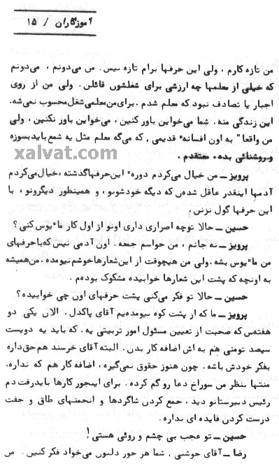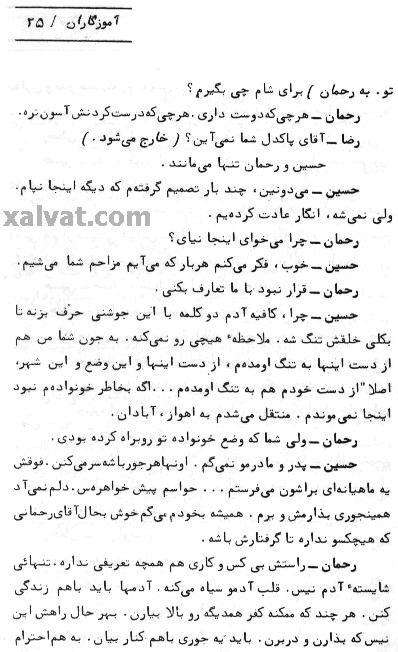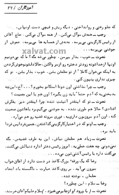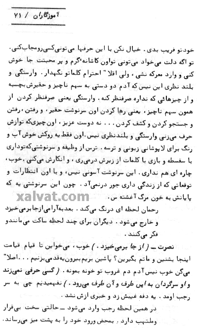 2. در نمایش «انتظار سحر»، حاجی فیروز بالای سر نوروز میایستد. دایره میزند و میرقصد و زیر لب ترانهٔ مشهورش را میخواند. نوروز غلت میزند. پشت اش را به او میکند و پلاس اش را بر سر میکشد. فیروز یکی- دوبار به روی نوروز خم میشود و دایره زنگی اش را به گوش او نزدیک میکند- گویی قصد بیدار کردن او را دارد... نمایشنامه آموزگاران، در ساحل، ملاقات، دونده تنها، مرد متوسط، در ایران نوشته شدهاست: در فرانسه: «قوی تر از شب»، «بن بست»، «در آخرین تحلیل»، «در یک خانواده ایرانی»، «انتظار سحر»، «یک مهمان چند روزه».