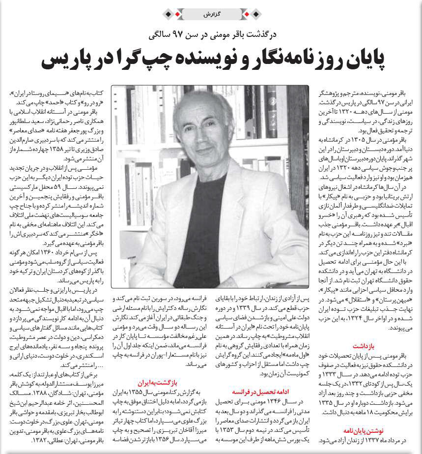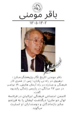 باقر مومنی پژوهشگر تاریخ، نویسنده، مترجم و فعال سیاسی روز یکشنبه 28 آبان در نودوهفت سالگی درگذشت. او که چند دهه پیش و در شرایط اضطرار ایران را ترک کرده بود سرانجام دور از ایران و در پاریس از دنیا رفت.