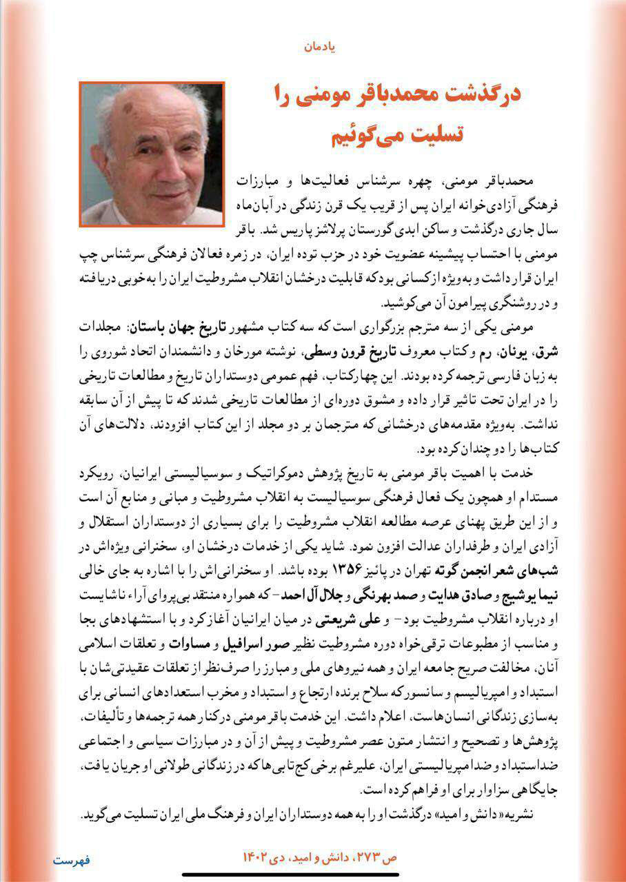از ملک ادب حکم گزاران همه رفتند شو بار سفر بند که یاران همه رفتند مراسم بزرگداشت و خاکسپاری رفیق دانا و اندیشورز توانای ما، باقر مؤمنی، مورخ، نویسنده، مترجم و کنشگر دیرینه ی چپ گرا 7 آذر 1402 ( در گورستان پرلاشز برگزار میشود. ( که ما را واگذاشت و گذشت، ساعت ده روز سه شنبه 28 نوامبر 2023) نشانی : تالار بزرگ پرلاشز Crematorium (coupole) Cimetière parisien du Père-Lachaise Avenue du Père Lachaise Paris 75020 Métro Gambetta. Ligne 3 خانواده و دوستان باقر مؤمنی