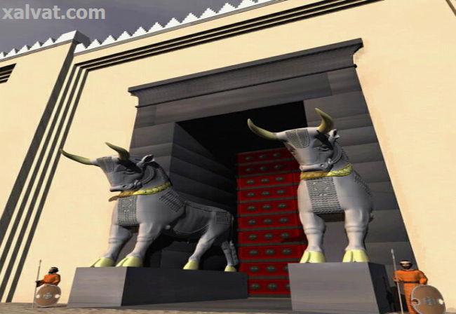 پیکره دو گاونر سنگی که نماد نگهبانی هستند، وجود داشت. دروازه ملل یک تالار