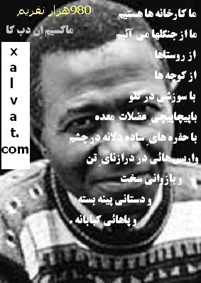 ما کارخانه ها هستيم ما از جنگلها می آئيم از روستاها از کوچه ها با سوزشی در گلو باپيچاپيچی ِ عضلات ِ معده با حفره های ِ ساده دلانه در چشم واريس هائی در درازنای ِ تن و بازوانی سخت و دستانی پينه بسته و پاهائی کبابانه .