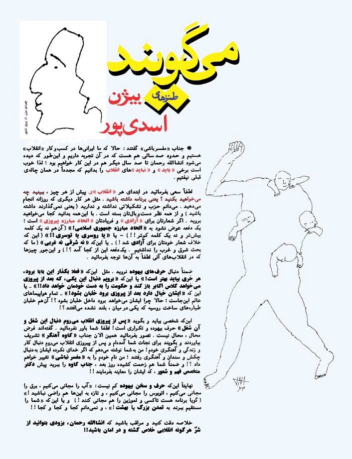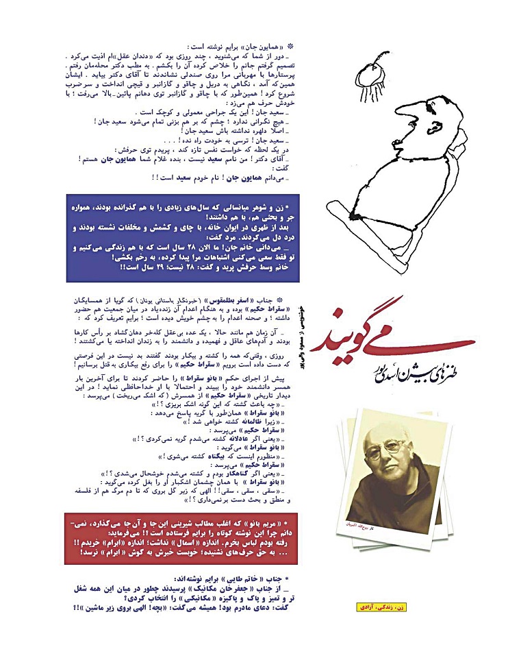بیژن اسدی پور ـ کشش من به مطالب فکاهی و طنزآمیز و نوشتن این گونه مطالب کاملا تصادفی اتفاق افتاد. اوایل که تازه شروع کرده بودم، مطالبی کاملا جدی می نوشتم و برای دوستان نزدیک و فامیل می خواندمـ می دیدم مطلب جدی من کاملا فکاهی شده است! روزی دوستی راهنمایی کرد و گفت ندیده ای کسانی برای «تخلص» شعری از دیوان حافظ فال می گیرند و حافظ آن ها را راهنمایی می کند؟ برای شما هم همین مطالب جدی دارند راهنمایی می کنند که جدا فکاهی بنویسید! دیدم درست می گویند! این بود که از همان زمان شروع کردم به فکاهی نویسی، یعنی مطالبی جدی می نوشتم که خودش به طور اتوماتیک فکاهی می شد! علی ـ از چه زمان همکاری تان به صورت حرفه ای با روزنامۀ توفیق و نشریات دیگر شکل گرفت؟